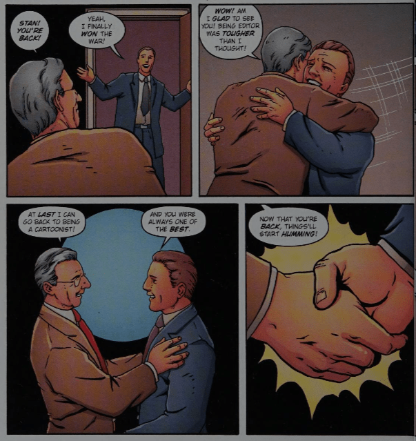 I remembered vaguely that there was, refreshingly, some pushback when this came out due to its blatant and sometimes heavy-handed reinforcement of the usual Stan/Marvel myth. What I find interesting is that the portrayal of Lee in this almost seems as if it’s glamorizing the collective impression of Stan, the “hip Uncle” figure that many grown men have claimed is how Lee came off to them in the Bullpen Bulletins. And really, Lee is portrayed as constantly in zany, creative motion- every other figure is bewildered or dismissive of Lee the visionary individual, constantly thinking of ways to engage the reader, constantly speaking out for the rights of the creator.