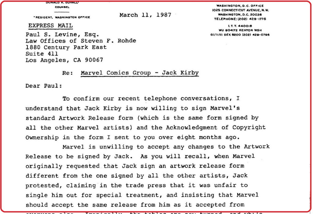 - “Mr. Kirby has not yet signed the artwork release form. He has insisted upon a special “condition” before he will sign the artwork release form and accompanying acknowledgement of Marvel’s copyright ownership, specifically that in any statement as to character creatorship by Marvel and Marvel licensees Mr. Kirby be given credit as sole creator of certain of Marvel’s characters…. Marvel realizes the creatorship question is a sensitive one…” Mike Hobson Marvel Comics V.P., July 1986
