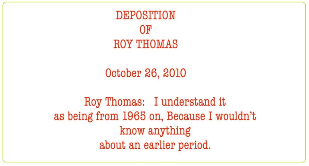 - “It offended me in that interview, and I was really pleased with the discussion that I thought was an intelligent discussion, trying to get to the FACTS… and, you know without, just from what you remembered from reading… I don’t have all the answers, I’ve never claimed I was there when most of these things were created… I came on board in early July of 1965…” – Roy Thomas
