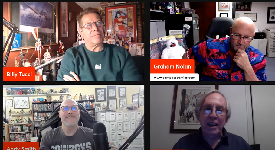 At 3:46, Roy Thomas appears complete with added in applause track. Tucci immediately cuts off whatever Thomas is saying at the outset by launching into two anecdotes about the delivery of a new lamp for his desk and then a porch Cam photo of a deer he’s trying to hunt.
