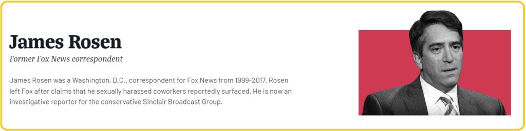 “In the winter following the September 2001 terrorist attacks, a female Fox News reporter joined the bureau from New York. In a shared cab ride back from a meal, Rosen groped her, grabbing her breast. After she rebuffed his advance, Rosen sought to steal away her sources and stories related to his interests in diplomacy and national security. That’s according to four colleagues who say she relayed the episode as a warning about Rosen’s behavior.”