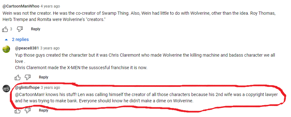 So, in Len Wein’s lifetime- Wein passed away in 2017- there is no public debate over who was the primary composer, if you will, for Wolverine. The rise of Thomas as a significant force is a relatively new development, as I’ve stated. Therefore, I was very surprised (though I shouldn’t be) to stumble upon some truly disgusting comments made a few years ago while researching this story. Those comments are made by lifelong failure and obnoxious man-child John “MEGO Stretch” Cimino, and they were made on YouTube videos featuring Wein.