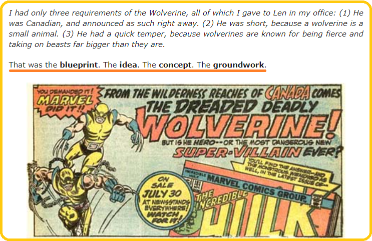 - “It’s a collection of different things. It starts with Roy. Actually, no it doesn’t… it starts with Brother Voodoo… which was set in the Caribbean which I loved writing… I loved writing accents, and I would write the accents in… Roy calls me in, “look I’ve been reading Brother Voodoo, and I hate you! I just can’t write accents, I’ve never been able to do this and I really admire your ability to write accents… I would like you to write a Canadian accent. So I have a name- Wolverine- and, give me a Canadian character.” – Wein, 2014 (obviously simplifying the story for a panel audience)
