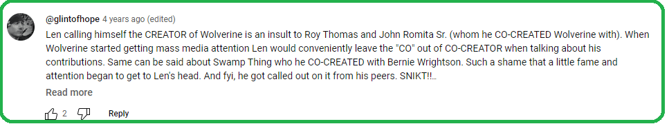 - “Len calling himself the CREATOR of Wolverine is an insult to Roy Thomas and John Romita Sr. (whom he CO-CREATED Wolverine with). When Wolverine started getting mass media attention Len would conveniently leave the “CO” out of CO-CREATOR when talking about his contributions. Same can be said about Swamp Thing who he CO-CREATED with Bernie Wrightson. Such a shame that a little fame and attention began to get to Len’s head. And fyi, he got called out on it from his peers. SKINT!!..” – CIMINO, 2019