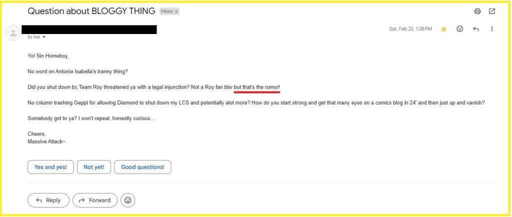 There were also two emails regarding Marvel artist Dustin Nguyen but I’m not informed about that specific story… guess I should’ve described to Bleeding Cool.