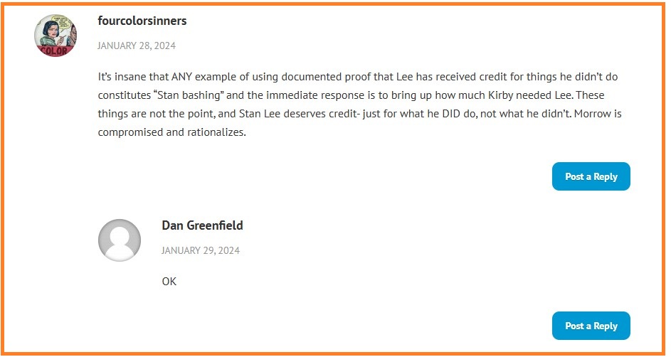 This makes it difficult to even begin to tilt the scales of awareness, to nudge the unaware into the true and colossal imbalance between Lee’s public perception (still cultivated by Disney/Marvel and nearly the entire comics industry) and the actual facts.