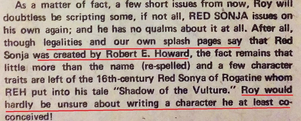 “The Rascally One had the audacity to write this Editorial in the back of a Sonja issue where he rationalizes that he should be credited as a creator- not an adapter- since Robert E. Howard’s version was spelled “SONYA””