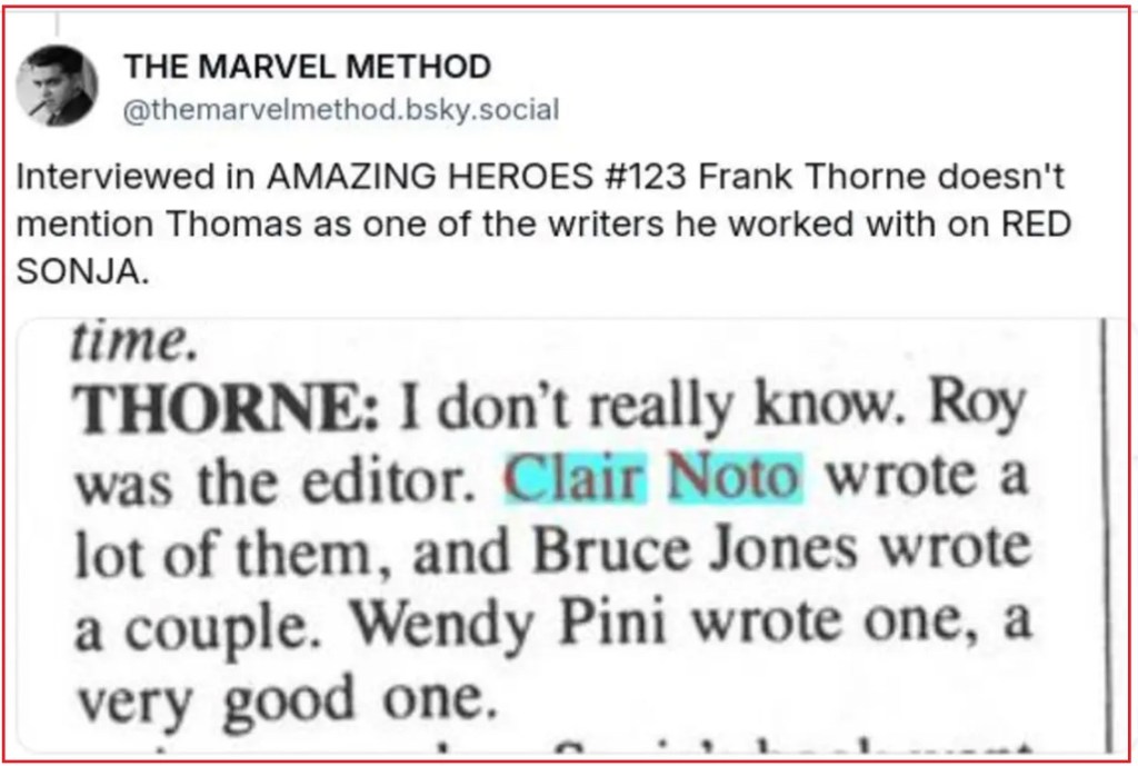 This is a man who has chosen to associate with John Cimino, so he’s already squandered whatever credibility he had. But still. I’m sure Clair Noto is complicated. Luckily, we have decades of Roy Thomas statements that lend themselves to the theory that Noto is telling the truth and Roy isn’t.