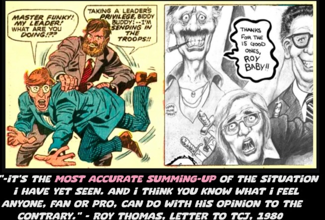 Roy Thomas, who for most of his engtire career in comics, was such a combination “fanboy”, “Golden Age” fanboy, and high schooll English teacher who never ever quite forgot that, tended to tell cleche stories with THE MOST AWKWARD dialogue in the history of the biz, stuff that makes S*** L** look really GREAT by comparison, and too often focuses on trivia and historical continuity rather than actually telling good stories. He was a STEP DOWN. (His CONAN work was way better.)