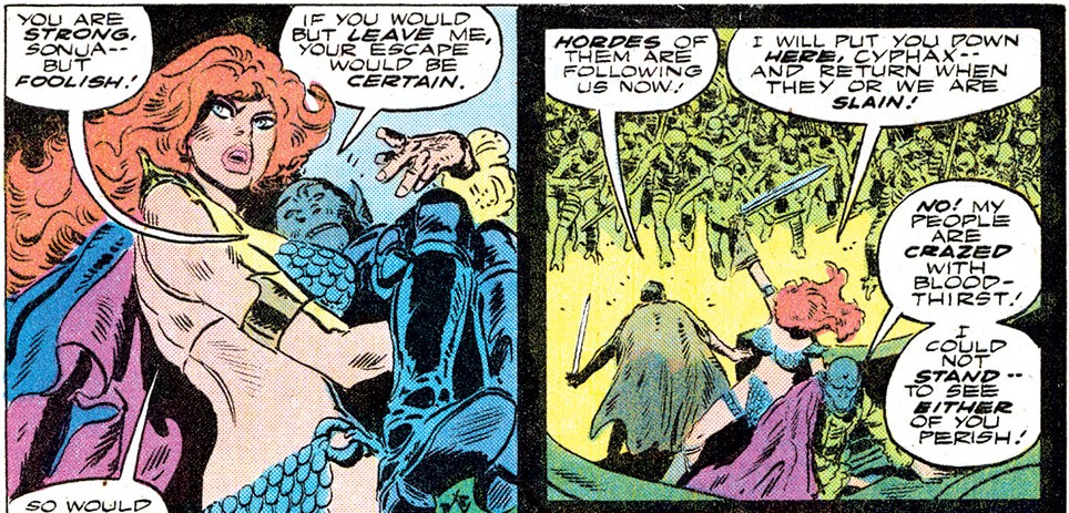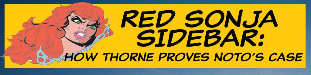 To be scrupulously fair to Mr Thomas, there were more differences between Howard’s Sonya & Red Sonja beyond just the spelling of their names: their backstories are completely different beyond transposing a historical character to the Hyborian Age. Both are swordswomen with fiery red hair & personalities to match, but there the similarities end.