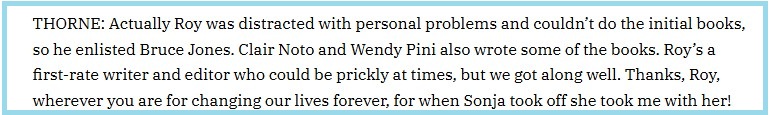 And I didn’t know anything about Thorne and, you know, I was going to be working directly with Thorne. And, you know- I found out pretty quick that Thorne was a dirty old man… and that, instead of Barry Windsor-Smith- the classier version of Red Sonja that he wrote- Thorne, it was going to be T&A. She was gonna look like a hooker! You know, I raised holy hell with Roy about this, right from the beginning, once I saw the drawings that Thorne did from my plot…”